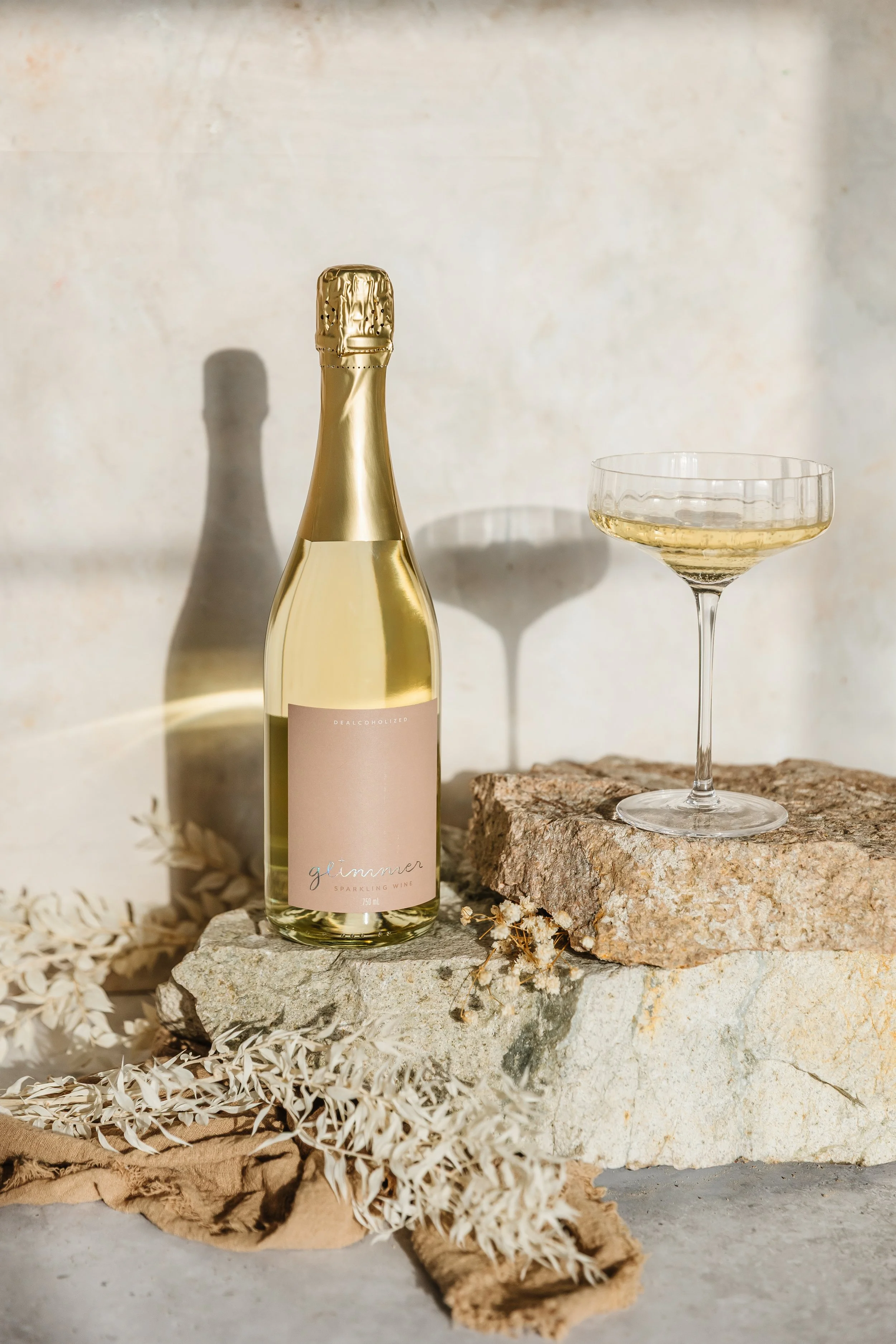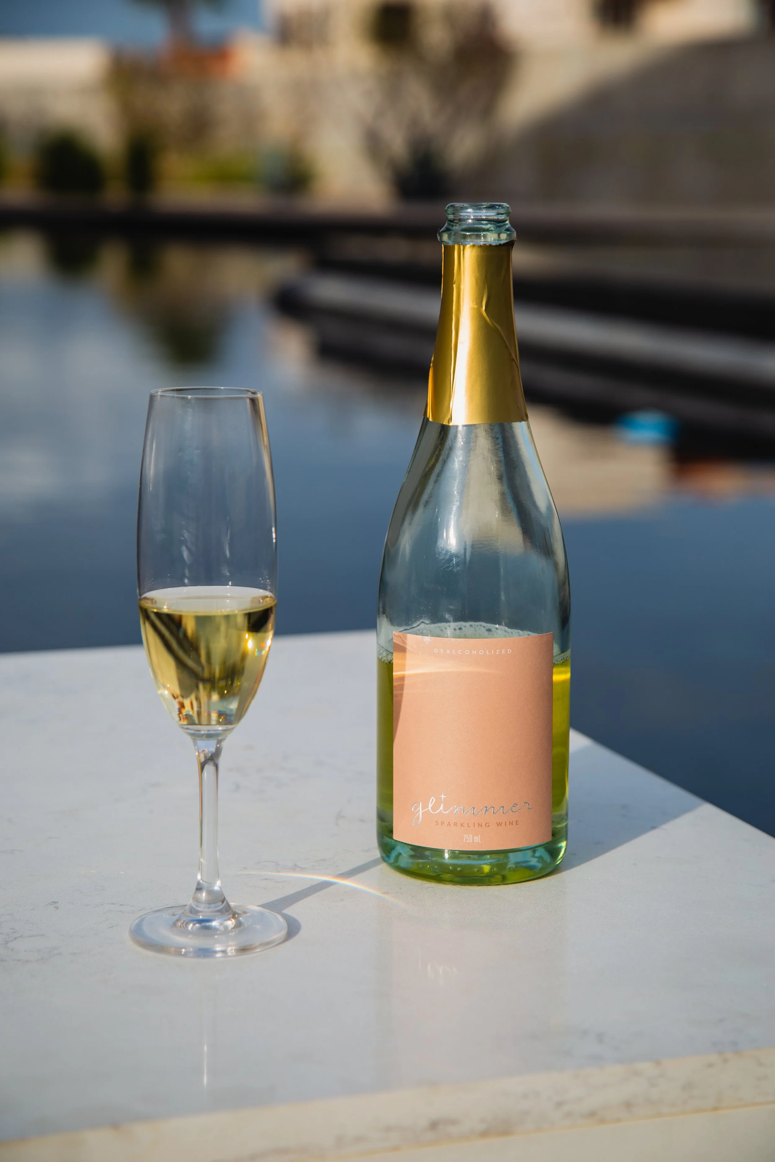 Glimmer is a premium dealcoholized sparkling wine made from traditionally fermented Chardonnay. Fine bubbles, a dry finish, and nothing to compromise on — before, during, or after the moment.